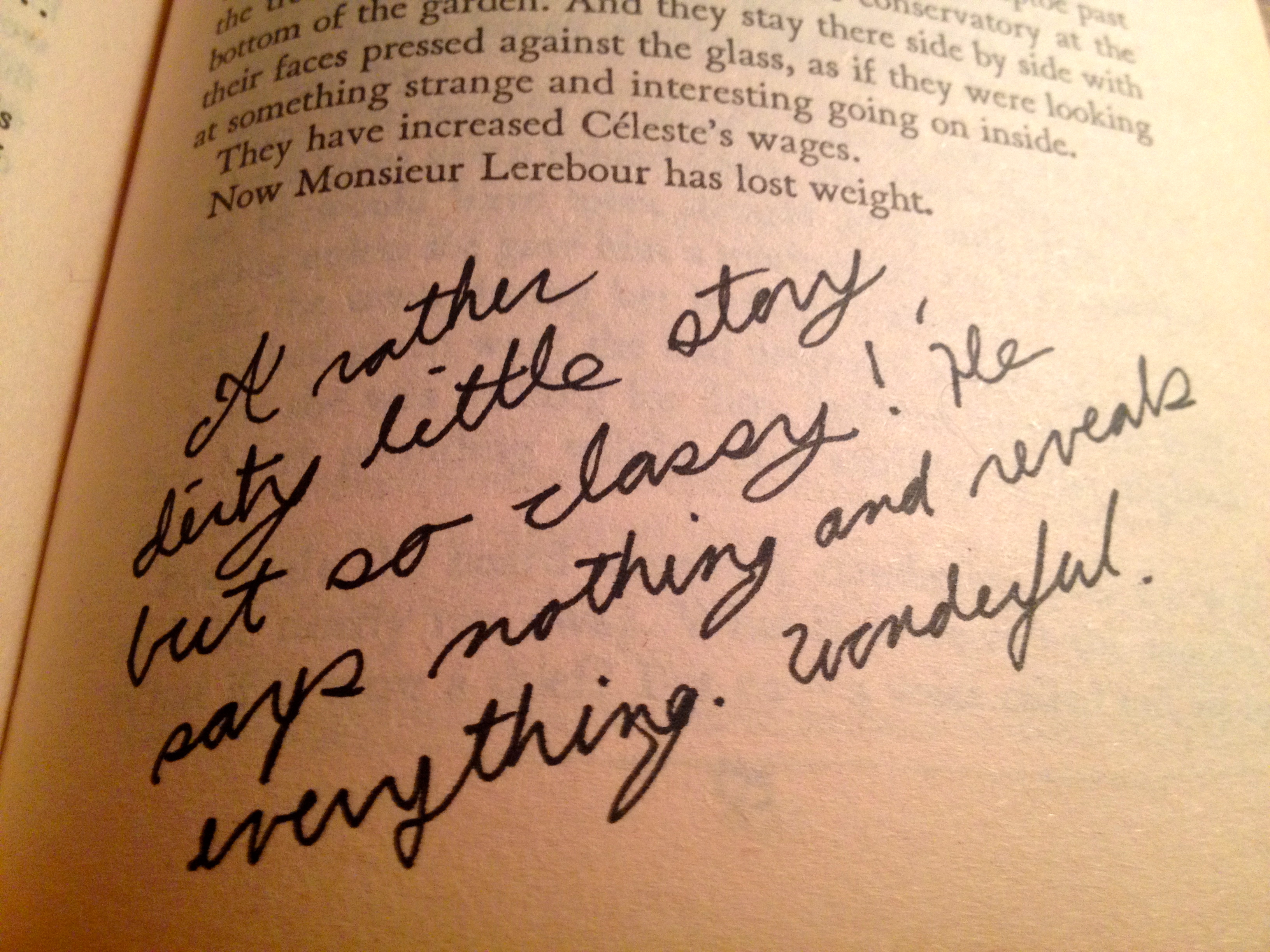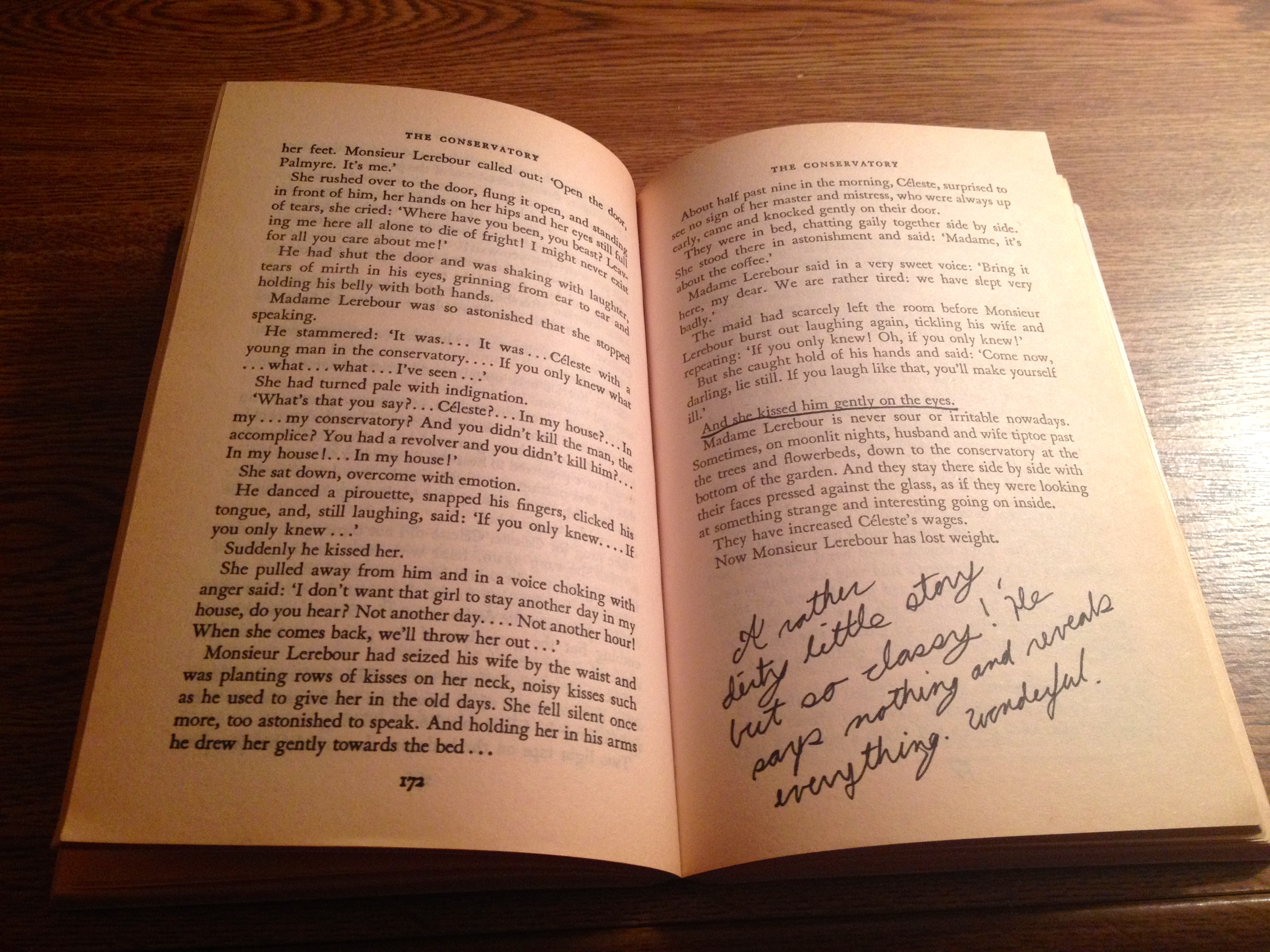 Pictured here is a note on, “The Conservatory”. How amazed I was, and still am, at his gifts of humor, twist, and sly revealing.