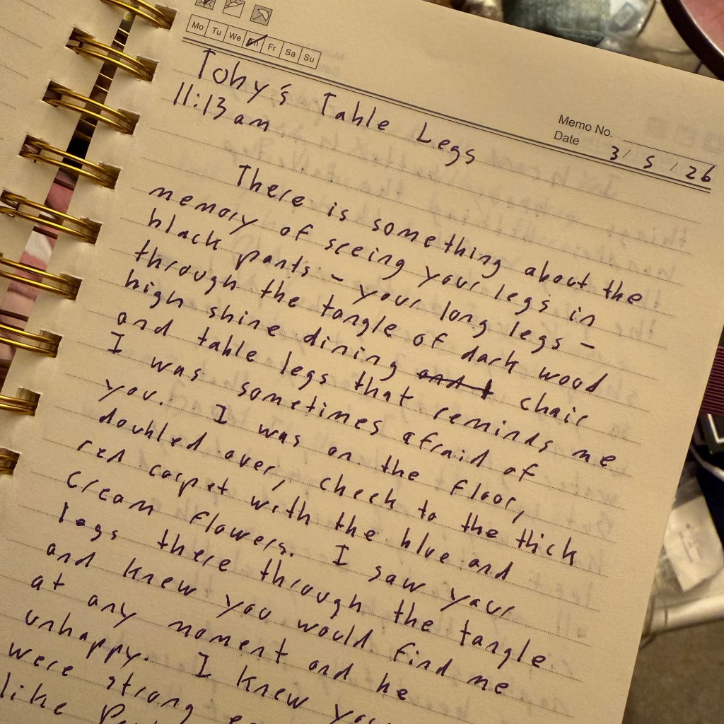 The problem is, the writing is for shit. Maybe that’s too harsh. Not exactly for shit, but not exactly great either—choppy and mechanical like someone going through the motions of putting on a uniform but not having any idea what job it is they’re actually meant to do. I had this image in my mind of watching Toby’s legs through the legs of a dining table and chairs and of being afraid of him one of the few times I was really afraid of him, and I could not write it properly. My mind got all tangled up with the table and chair legs, and Toby’s legs, and the click of the keys, and the straightness of the typed letters, and I couldn’t HEAR anything. I was writing, but my soul was deaf.